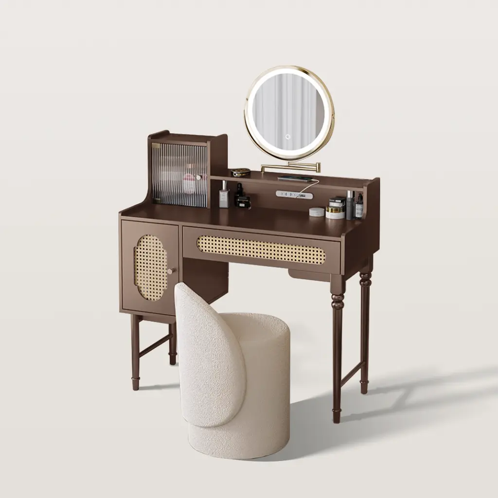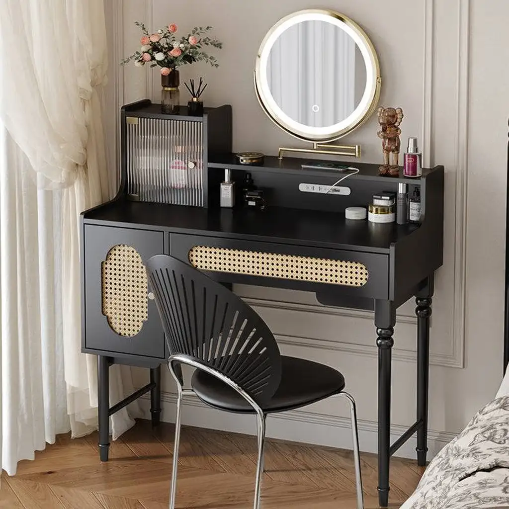 American-style Bedroom Makeup Vanity with Rattan Storage Cabinet
