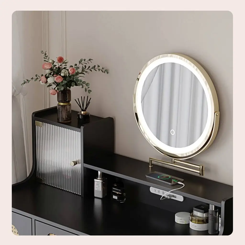 It is equipped with front side drawer cabinet and table top translucent locker, which can easily accommodate cosmetics, skin care products, perfume and trinkets.