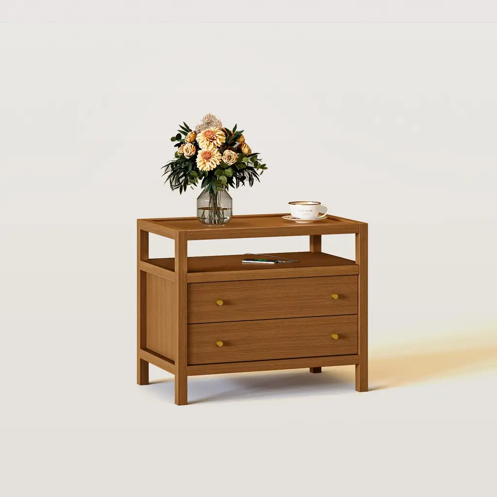 This nightstand also as bedside table is made of wood and plywood, with a natural finish that creates a solemn and natural atmosphere in the bedroom. The wooden bedside table adopts embedded panels, attracting people’s attention to its clean architectural lines, which can echo the linear appearance of the bed. The spacious double drawer bedside table floats on the top shelf, and there is a power board inside the top drawer, visually maintaining the simplicity and cleanliness of the bedside table, and functionally coinciding with modern popular lifestyles.