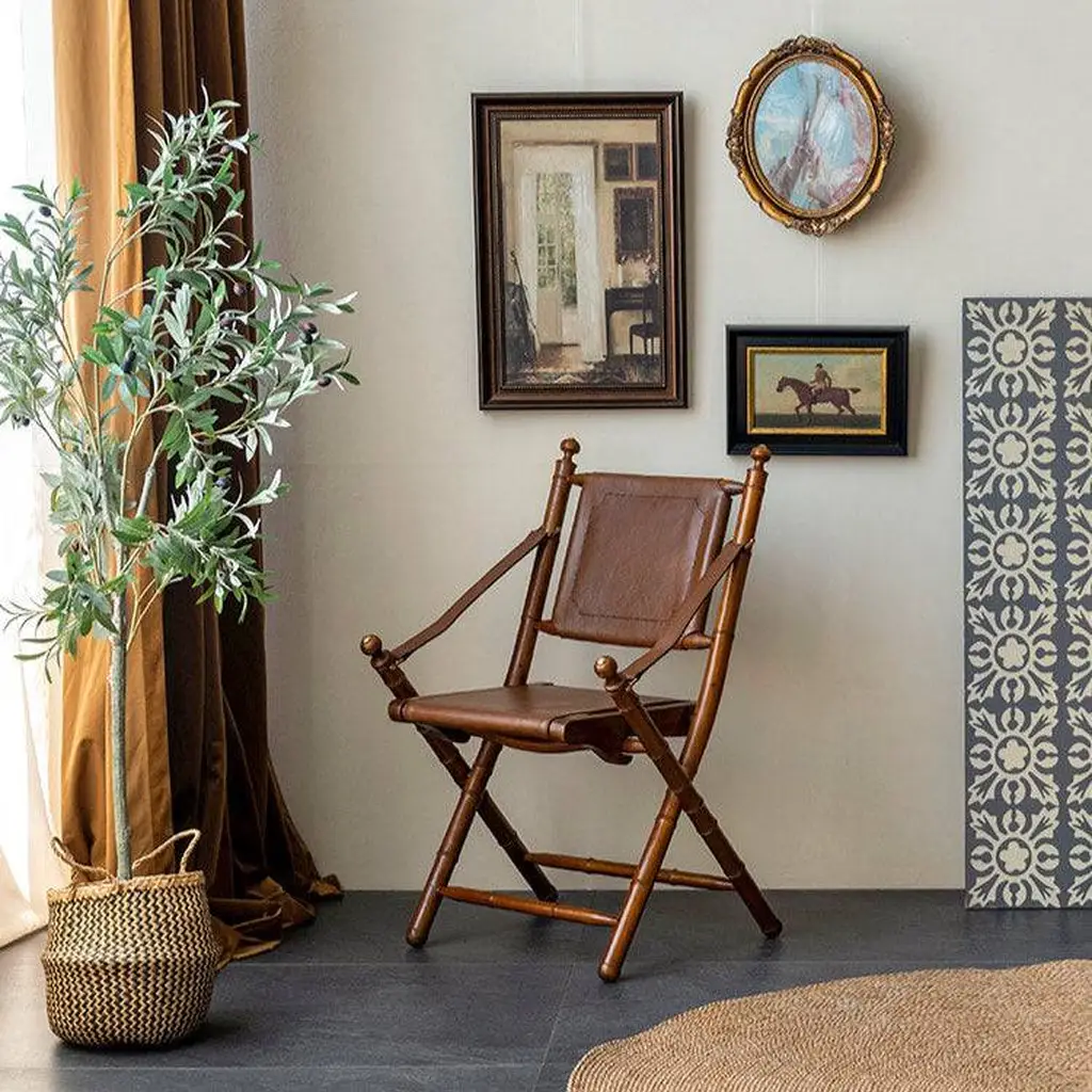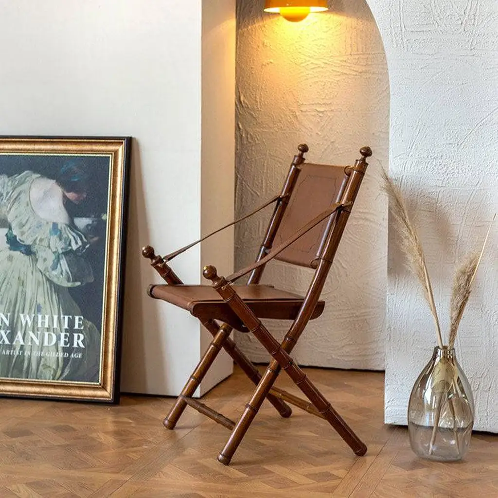 Leather folding chair is soft and breathable, with a delicate touch, wear-resistant and waterproof, balancing comfort and durability. The bamboo shaped frame is finely polished and paired with copper colored accessories, providing a warm and durable texture.