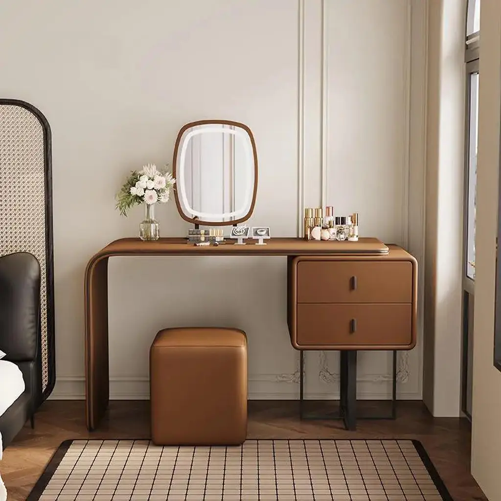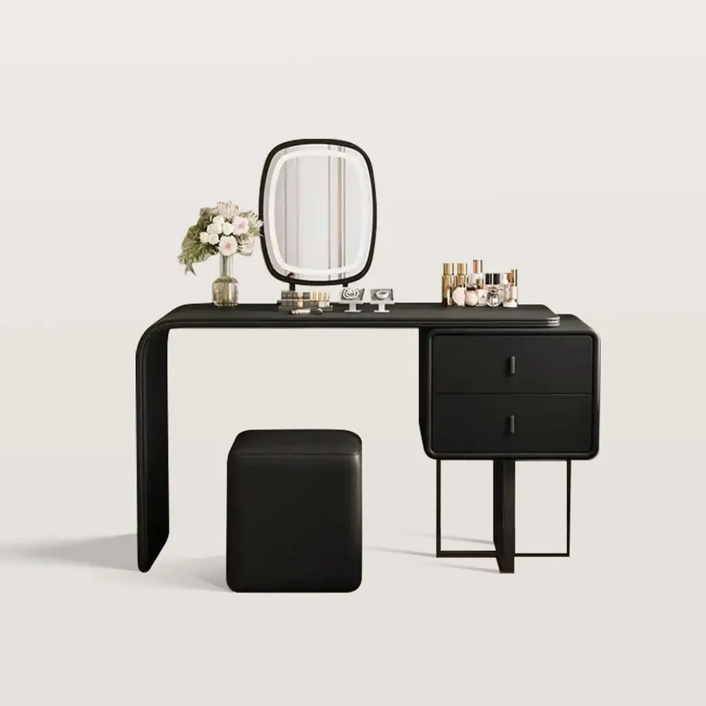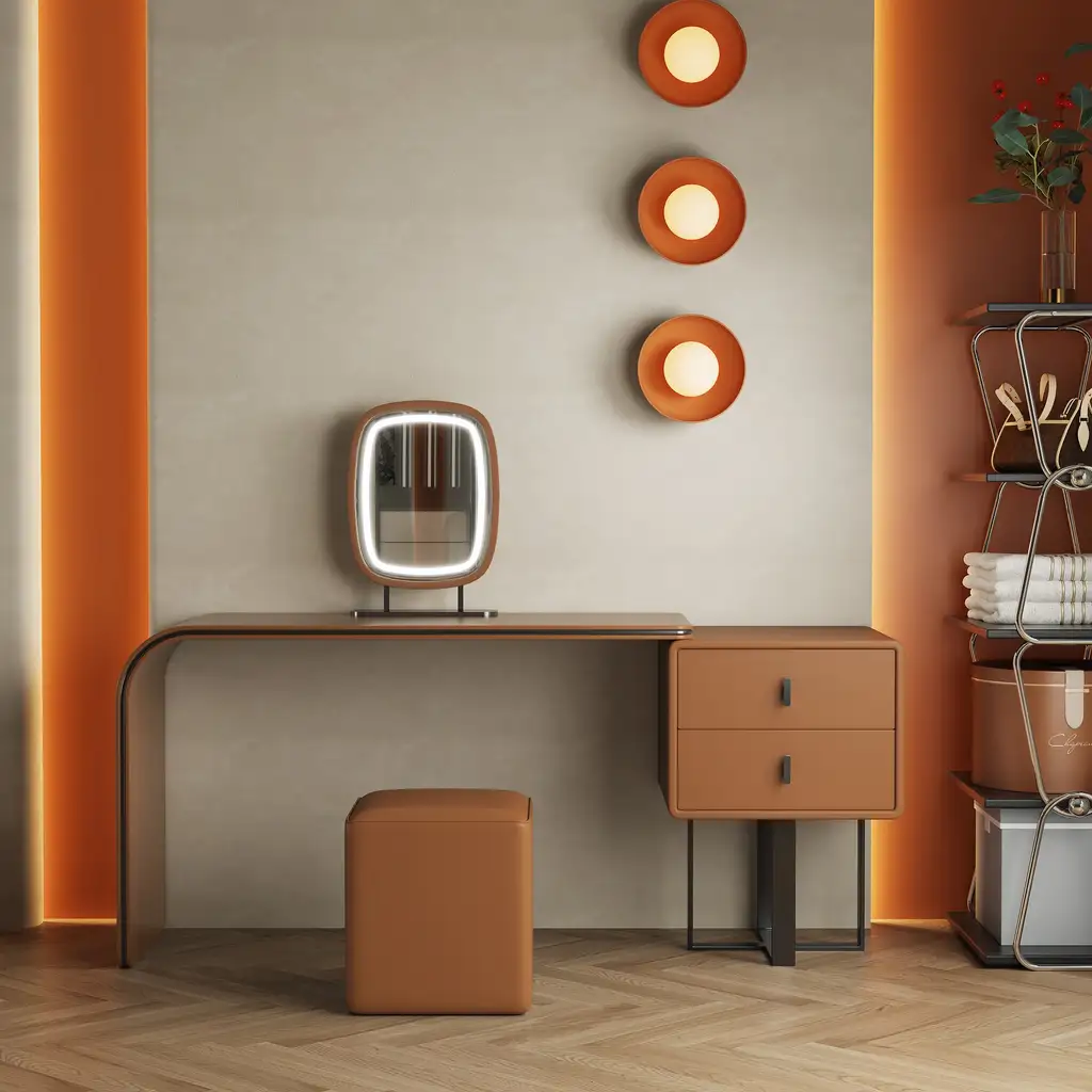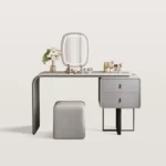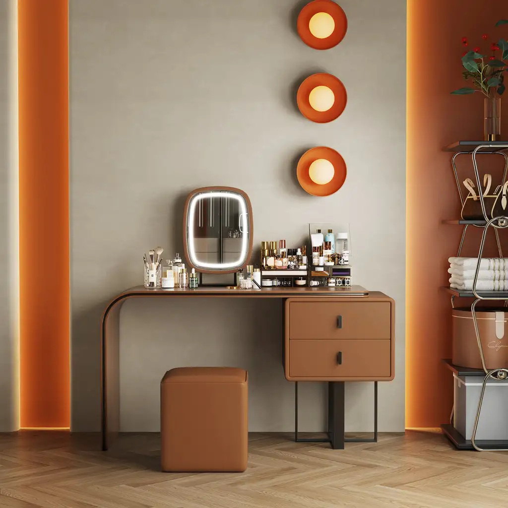Modern makeup vanity desk with simple design, it with lights and drawers is simple yet fashionable, this lovely dressing table is an elegant set of furniture for bedrooms. The makeup vanity set with high quality material subtly give the perfect color contrast to complete the bedroom decor.
